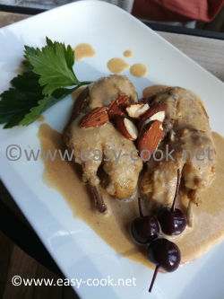 Déposer les cailles sur les assiettes. Garnir avec les amandes entières et les griottes verser un peu de sauce et décorer avec un brin de céleri.