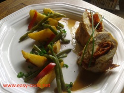 Laver et prélever la partie jaune des citrons (zester ) avec une râpe fine. Faire dissoudre dans une petite casserole le bouillon cube dans 1/2l d’eau. Inciser les filets de poulet en deux dans le sens de l’épaisseur (en portefeuille sans les couper complètement) Saler, poivrer et placer à l’intérieur les tranches de chorizo Parsemer de zestes de citron Refermer les filets de poulet et les placer dans du papier film Les faire rouler sur le plan de travail en maintenant les deux extrémités afin de former un " boudin " serré. Les plonger dans le bouillon frémissant et cuire 20 min à feu doux Retirer le film une fois les roulés de dinde cuit et les faire colorer 2 à 3 min en les retournant, à la poêle avec un morceau de beurre. Dresser en coupant légèrement la base pour faire une assise, puis trancher en deux en biseau.
