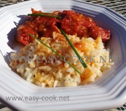 4 saucisses de Montbéliard ou fumée 1 oignon 2 gousses d’ail 4 grosses tomates 1 petit piment haché 1/2 c à c de cumin 1/2 c à c de curcuma 1/2 c à c de gingembre 1 dosette de safran 1 branche de thym sel, poivre 3 cuillers à soupe d’huile d’olive.