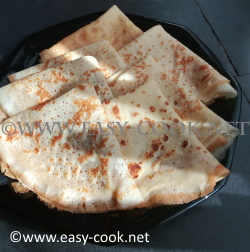 Faire chauffer la poêle et réaliser les crêpes. Verser une petite louche de pâte dans la poéêle bien chaude et incliner vivement la poêle pour répartir la pâte.
