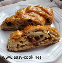 Êmincer finement les pommes, arroser avec un filet de jus de citron. Ajouter les amandes effilées, les raisins secs ; le beurre fondu, la cannelle et le sucre et mélanger le tout.