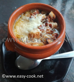 Répartir le bouillon dans des bols individuels allant au four. Recouvrir des rondelles de baguette et d'emmental. Faire gratiner quelques minutes à four th.7 (210°). Servir dès la sortie du four.