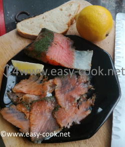 Saupoudrer assez librement de gros sel en tenant compte que c’est le sel qui va cuire le saumon. Après ajouter le poivre. Cela dépend de votre goût, mais on peut se permettre d’en mettre pas mal. Après cela vient l’aneth. Cela aussi peut être utilisé librement et pour finir le Cognac, whisky ou Aquavit, que vous devrez verser dessus librement en tenant compte aussi que l’alcool est un stérilisant.