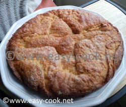 Laisser reposer 1/2 heure. Ajouter le sucre et le beurre. Donner quatre tours de feuilletage. Mettre cette pâte dans un moule beurré et cuire au four à 220°C Saupoudrer de sucre et servir tiède