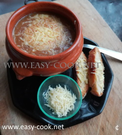Préchauffer le four à 220°C et faire colorer les tranches de pain ou de baguette. Goûter la soupe et rectifier éventuellement l'assaisonnement. Sortir le pain du four et répartir 75 g de gruyère râpé, remettre au four pour faire fondre le fromage.