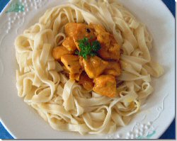 Mettre les tagliatelles à cuire. Pendant ce temps, hacher l'oignon et couper les escalopes de poulet en petits morceaux. Beurrer la poêle et mettre l'oignon à dorer.Quand l'oignon est doré, ajouter les morceaux d'escalope de poulet. Lorsque le poulet est doré, incorporer la crème fraîche.Lorsqu'elle commence à bouillir, ajouter le curry, saler et poivrer. Êgoutter les tagliatelles, les déposer dans un plat et ajouter le poulet et la sauce curry.