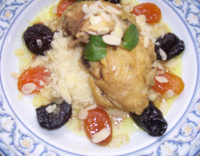 1 poulet fermier de 1,2 kg coupé en 8 morceaux 350 g de mirabelles 50 g d’amandes 1 citron 2 oignons 1 bouquet de coriandre 12 olives noires 1 bâton de cannelle huile d’olive noix de muscade piment de Cayenne sel, poivre